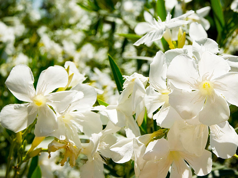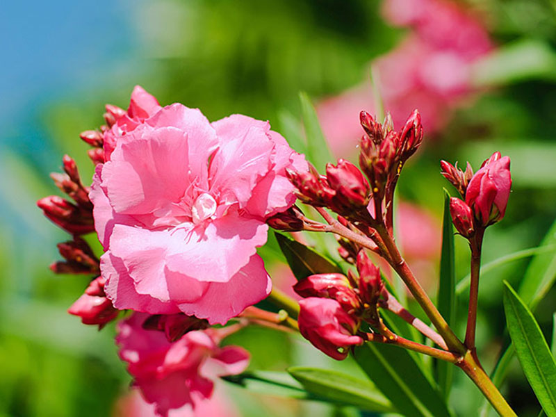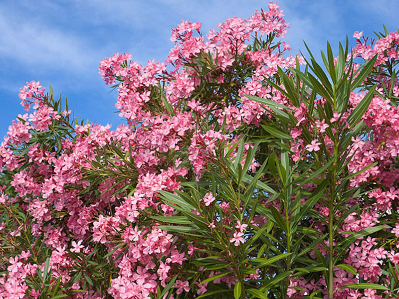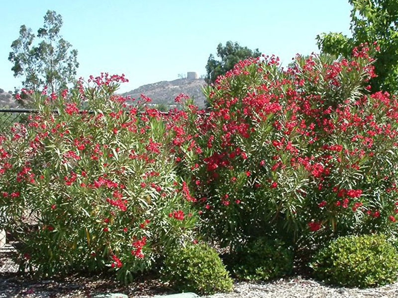 All parts are poisonous if ingested, don't burn prunings, smoke can cause severe irritation to the mucous membranes. This is an extremely hardy plant, take very little water once established. Makes a quick hedge, wind barrier or sight break. Does not do well in the shade. Varieties include Mrs. Roeding:double salmon-pink flowers grows 6' tall and has smaller leaves; Petite Pink and Petite Salmon grow 3-6 feet tall and as wide, can be kept at the lower end with pruning; Sister Agnes: a single white flower and the most vigorous grower, often reaching 20 feet.
