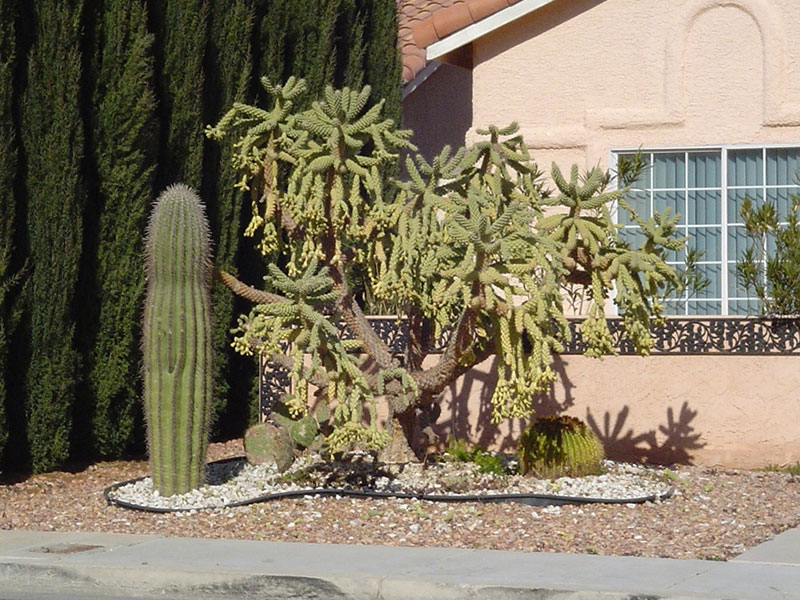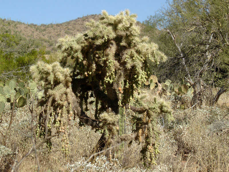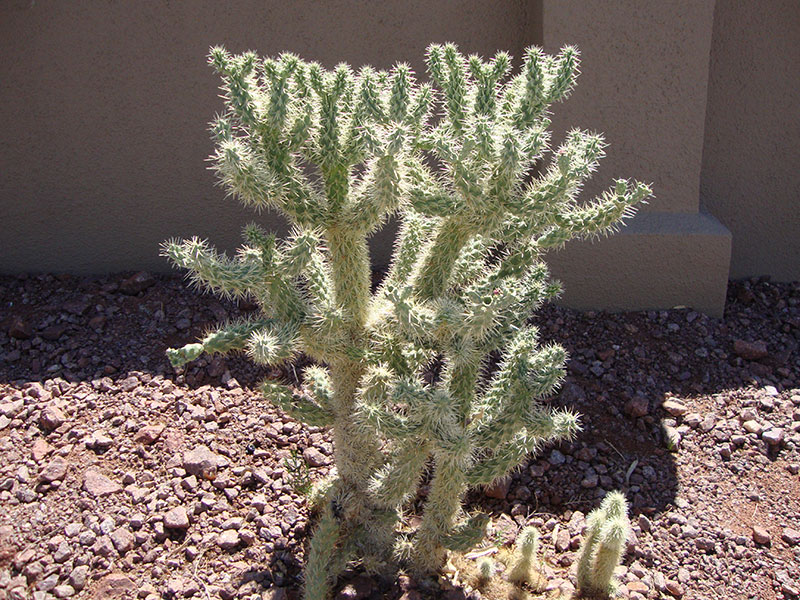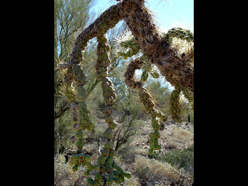 Interesting plant that gets its name from its blooming cycle. The flowers are followed by dry fruit, then the fruit stays on the plant and produces more flowers, in turn producing a 'chain of fruit'. As with all Cholla cactus, use caution and good judgment where to place the plants. Spines are vicious and painful, keep away from children and pets.