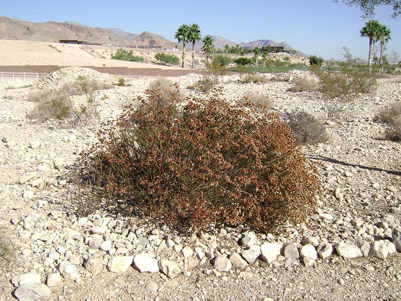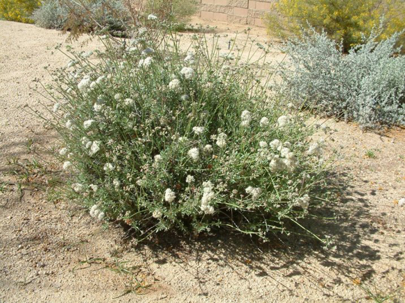 A compact, rounded, evergreen shrub with narrow, leathery, medium to dark green foliage and small clusters of white to pale pink flowers. A mass planting of this would have a striking appearance when in bloom. Use as a companion with other xeric plants such as Mojave Aster, Indigo Bush, Salvias and wildflowers. Does well on rocky road cuts and in shallow soils that are inhospitable to annual grasses. Would provide softening and contrast in a cactus garden. Cut back in winter or early spring to reduce woody growth.