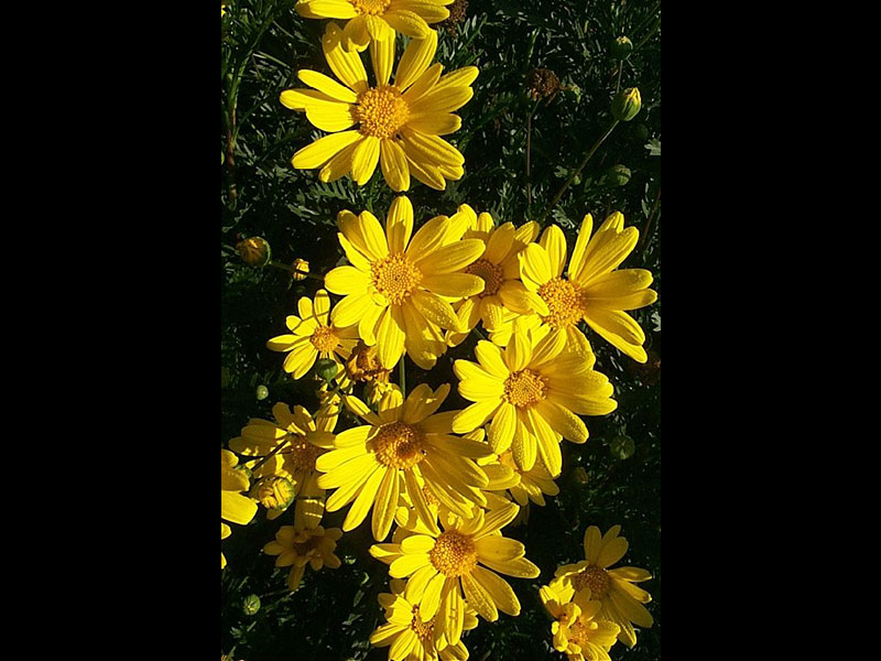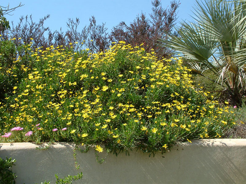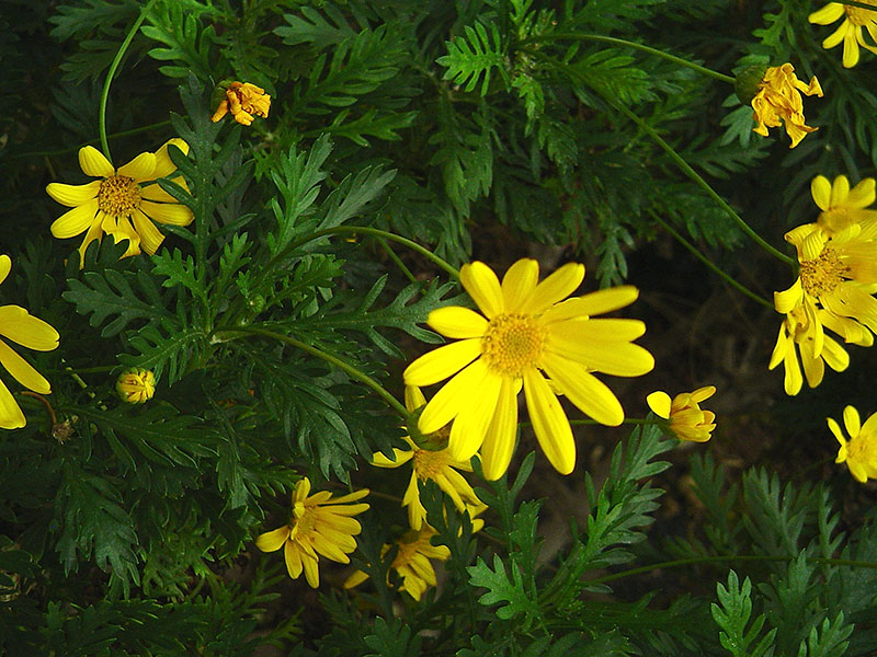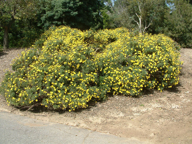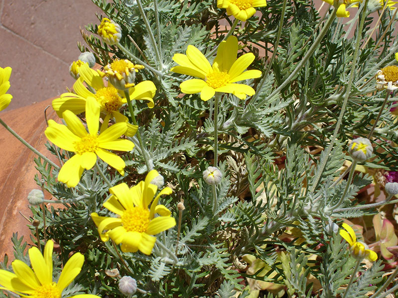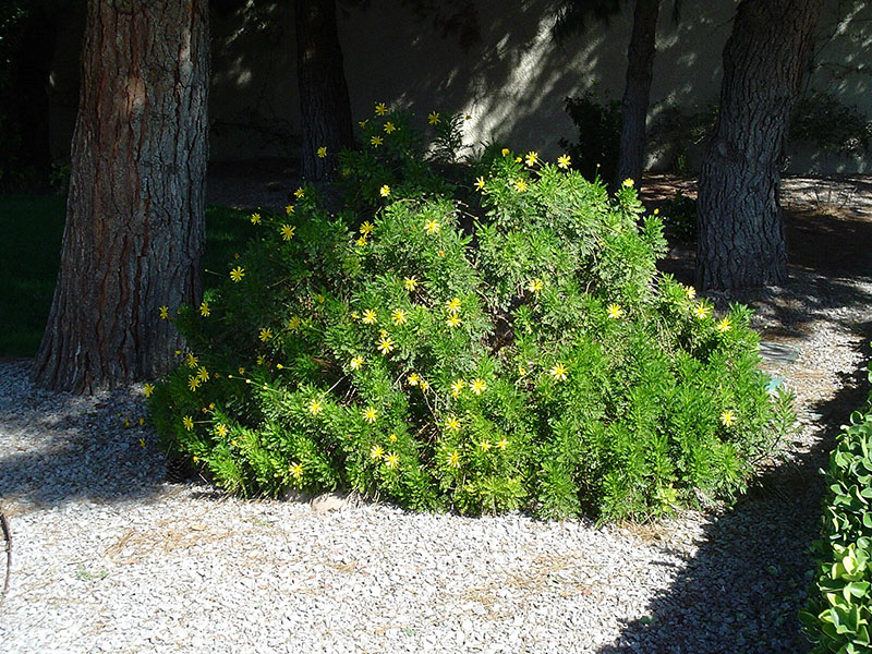 Yellow daisy-like flowers and finely-toothed gray-green foliage cover this large woody perennial. Has a rounded mature habit. Dead head frequently to encourage continued blooming. Prefers afternoon shade in our low desert environment. Does best with well-drained, amended soils and organic surface mulch. Apply a light organic fertilizer in spring and autumn. Tends to be woody and short lived here in Las Vegas. Variety 'Viridis' has medium to dark green foliage.