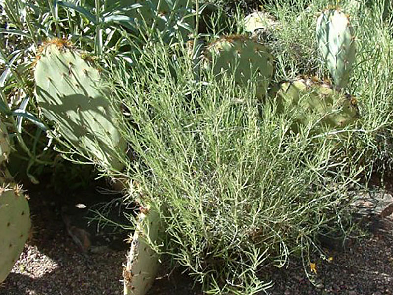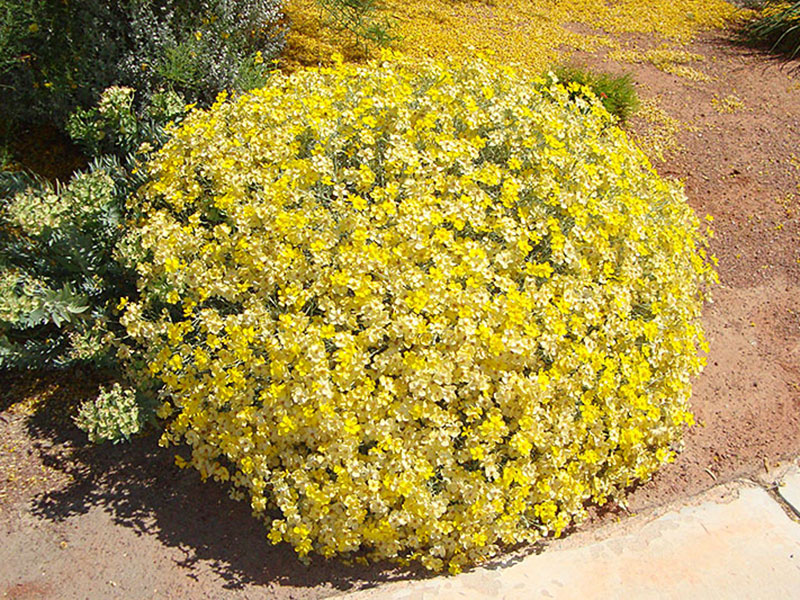 Southwestern native. Mojave Desert native. Woody-based perennial with a low, mounding habit. Small, slender, light green to gray-green leaves. Leaves at the base are thicker and more rounded. Stems are covered with white woolly hairs. Blooms at the branch tips. The bright yellow flowers dry to an ivory color and remain on the plant. Flowers attract butterflies and bees. Seeds a food source for birds. May re-seed into the landscape. Becomes straggly when older. Can shear back in late winter to encourage bushy habit. Leaves are poisonous if eaten. Synonym: Riddellia cooperi.