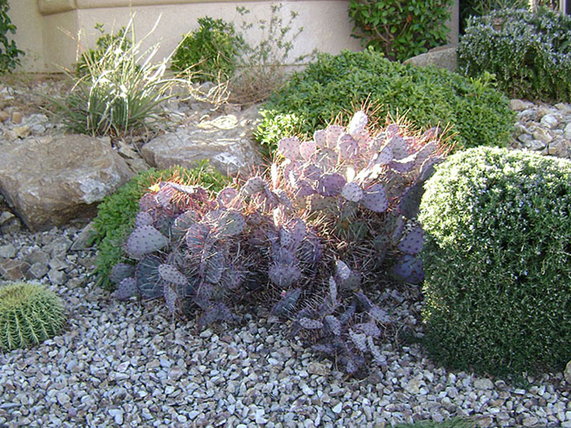 The Black-spine prickly pear has attractive 2 to 3 inch yellow flowers with red centers blooming in late spring or early summer. Growing from the pads are long black spines which contrast nicely against the gray to purple pads. Give this cactus a little extra water during the hot summer months. Synonyms: Opuntia violacea, Opuntia violacea macrocentra.